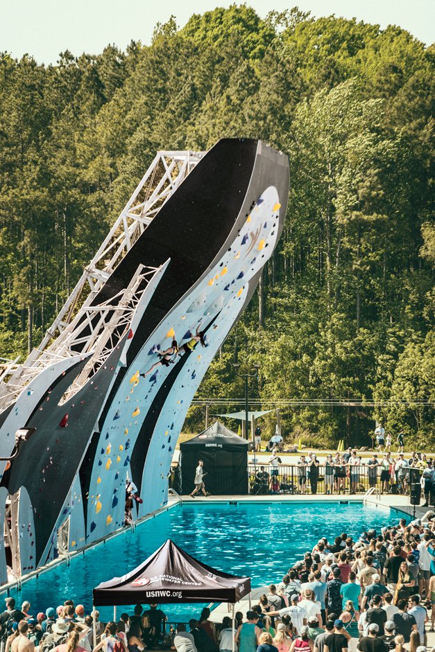 The climbers were surrounded. Whitewater rapid channels packed with rafters, kayakers, and paddleboarders held down the aquatic territory. Mountain bikers, runners, canines, and spectators handled the land. Even the airspace above the climbers was occupied with zipliners soaring across the facility.