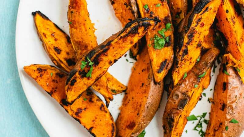 If you’re trying to trim down, they’re stuffed with filling fiber. For a satisfying meal, bake them in the skin. Or serve them on the side, mashed, roasted, or chopped into a savory stew. White potatoes have their assets — both tater types are fat-free — but the sweet ones have slightly fewer calories and carbs.