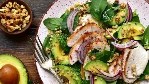Lunch: Grilled chicken salad (spinach, avocado, olive oil)
